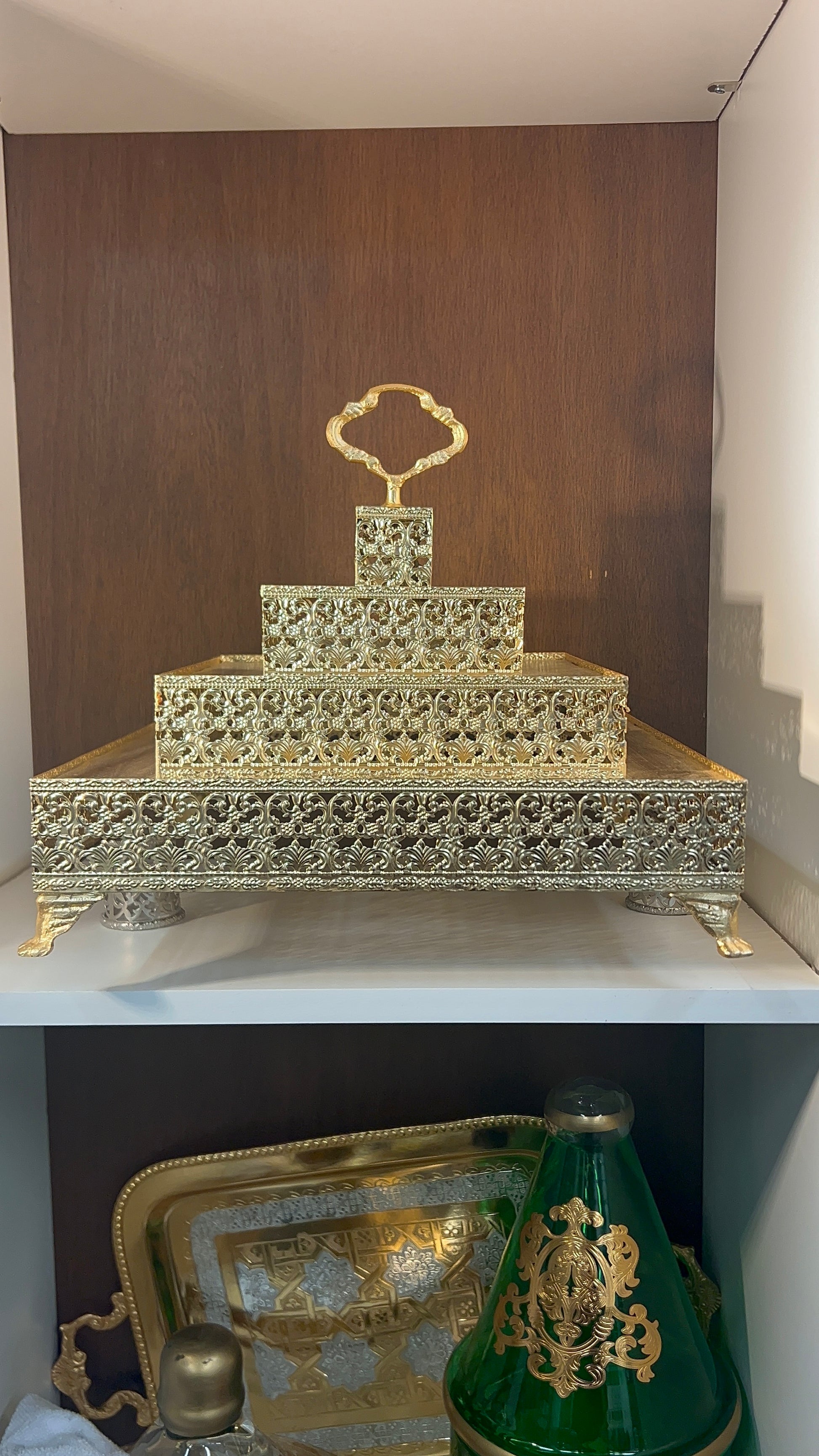 Présentoir à dattes élégant en cuivre à trois niveaux, orné de motifs artisanaux raffinés. Idéal pour présenter dattes et confiseries avec une touche traditionnelle et élégante.