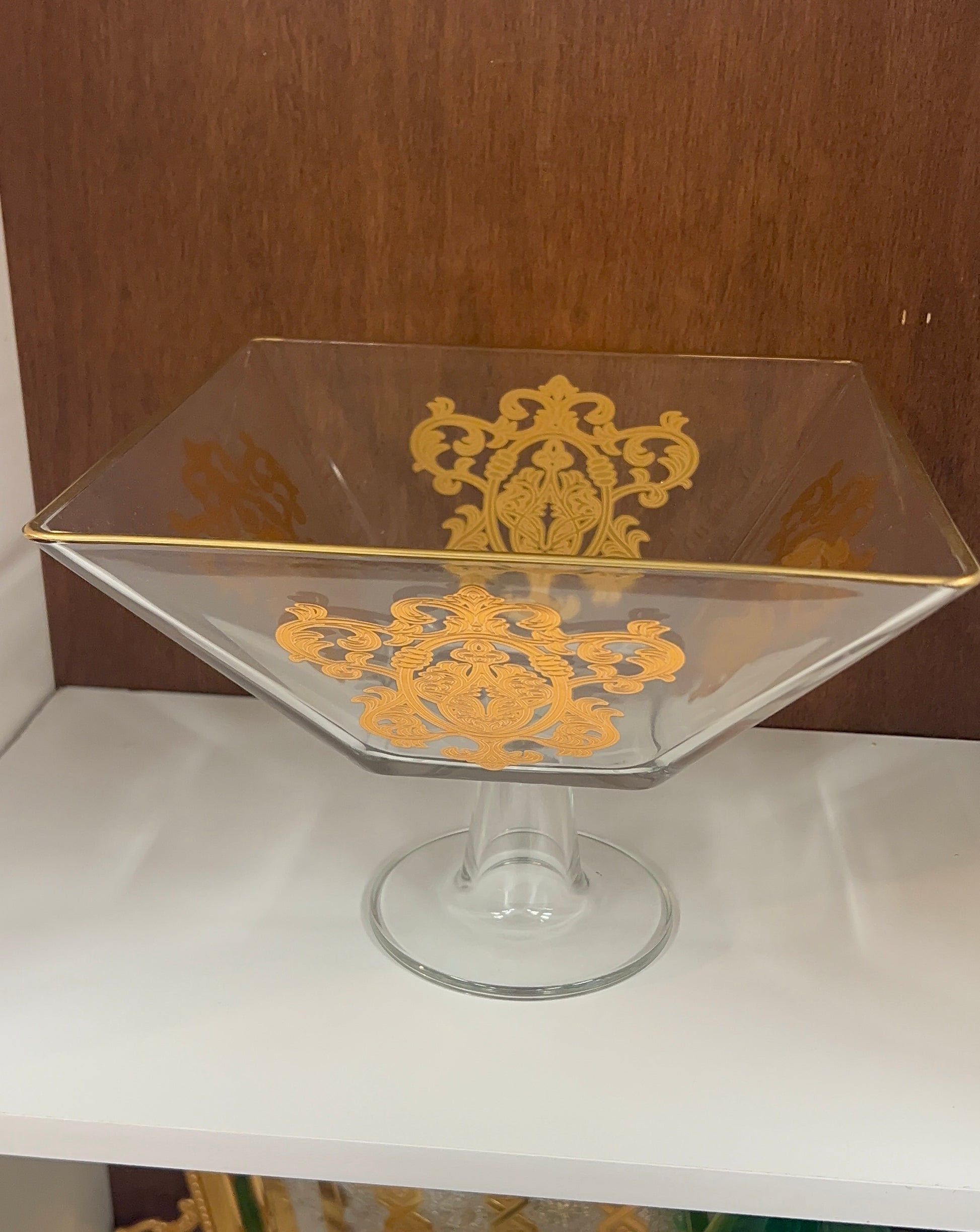 Legrand bol sur pied Sultana, orné d'un élégantmotif doré, est idéal pour présenter gâteaux, desserts, fruits ou confiseries. Son verre de haute qualité et son design raffiné apportent une touche de luxe à toute table, ce qui en fait une pièce maîtresse idéale pour les réceptions, les célébrations ou au quotidien.