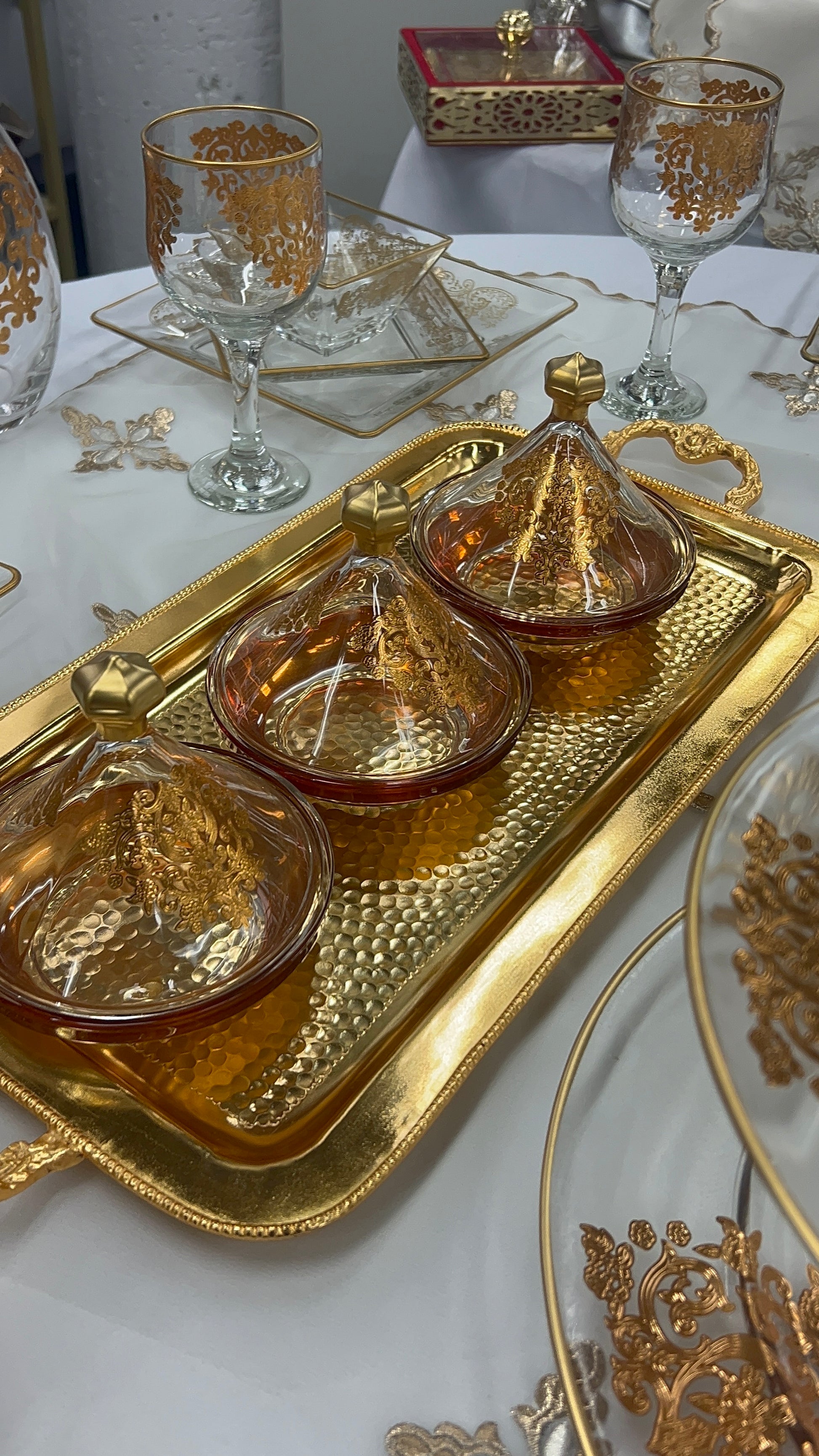 Sublimez votre table avec ces ravissants mini tajines en verre de 15 cm , parfaits pour servir douceurs, fruits secs, dattes, épices ou amuse-bouches. Confectionnés en verre transparent teinté d'une chaude nuance ambrée, chaque tajine arbore un exquis motif marocain doré, réalisé à la main , pour une allure à la fois luxueuse et traditionnelle.