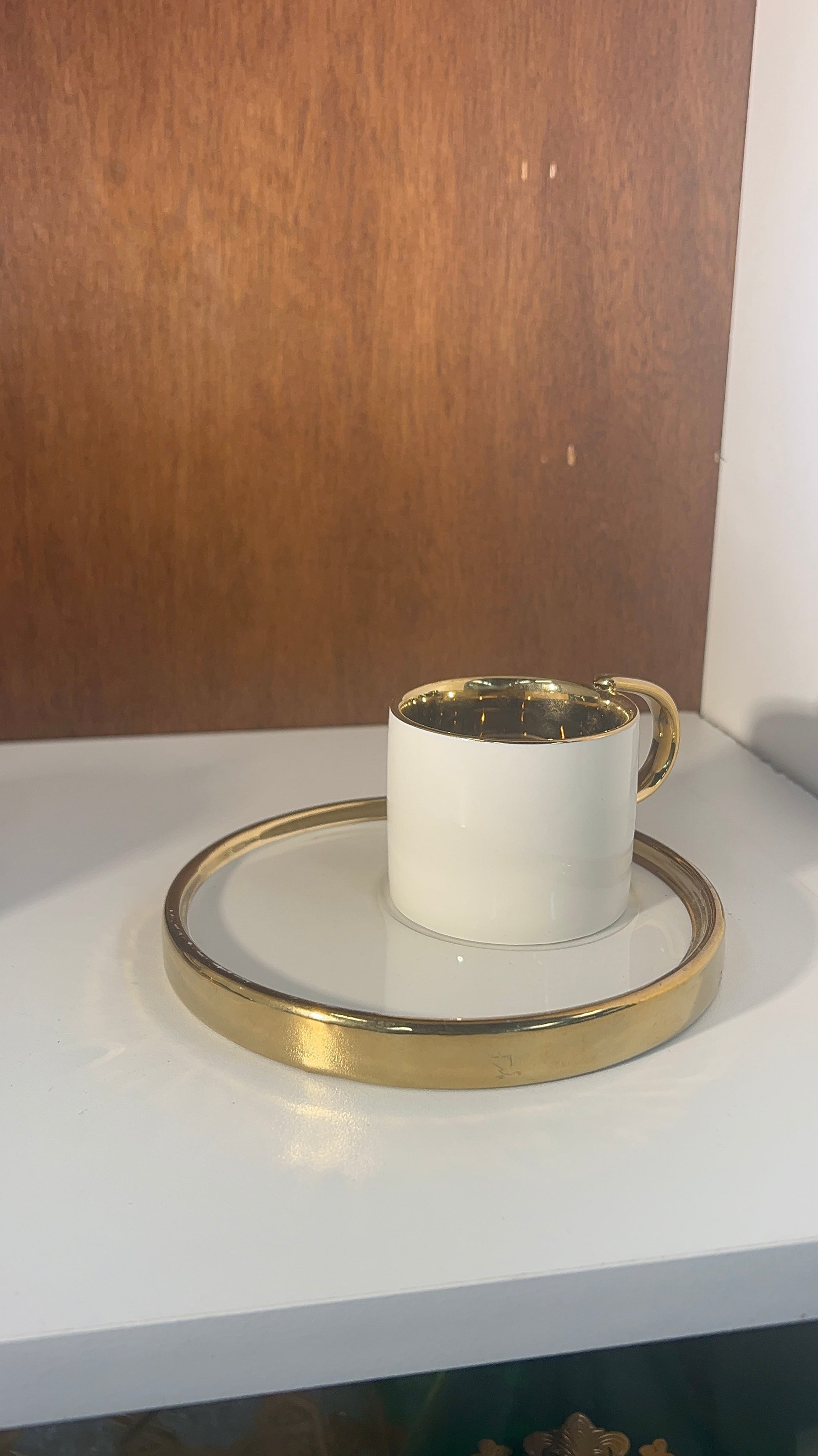 Élégant ensemble tasse et soucoupe à expresso, finition brillante et liseré doré. Disponible en noir ou blanc, idéal pour servir le café avec une touche raffinée et moderne.